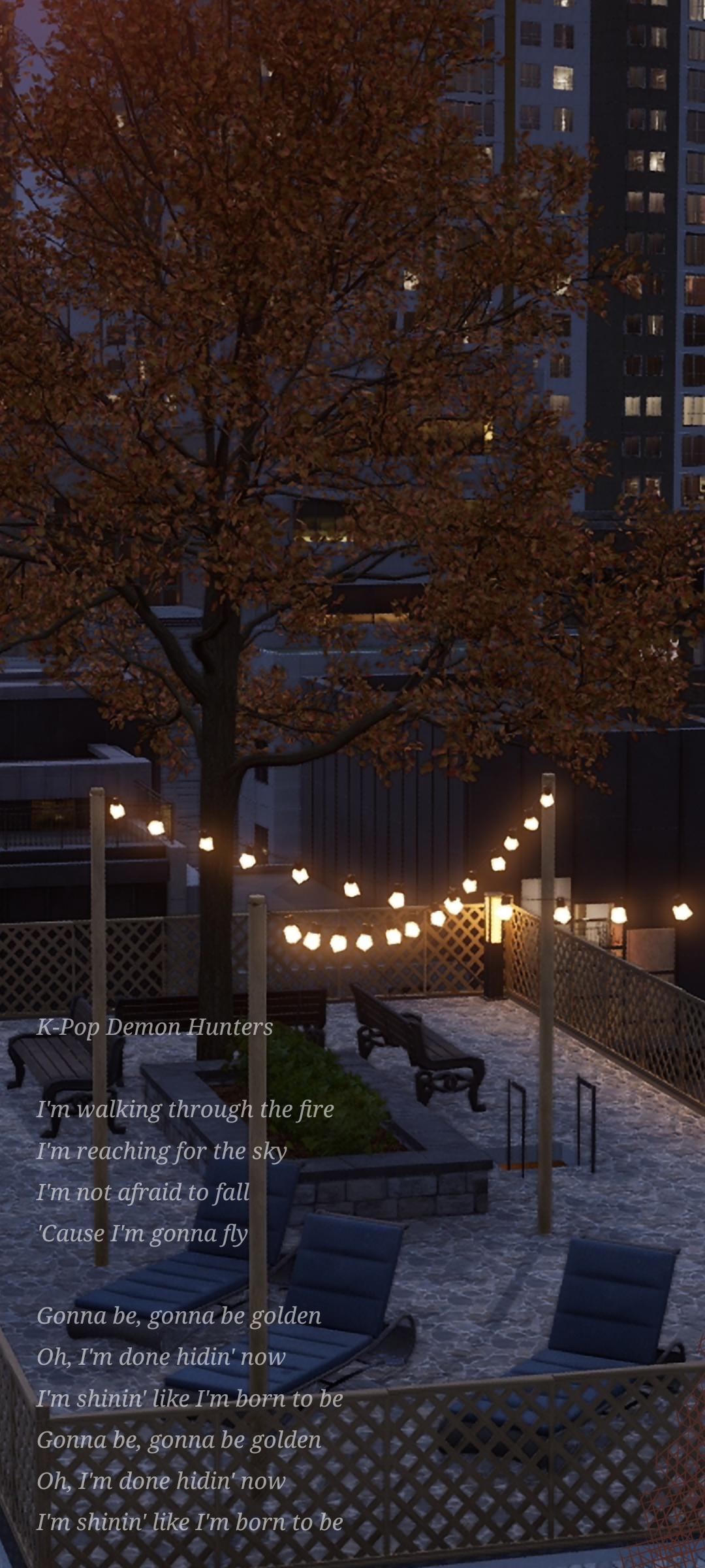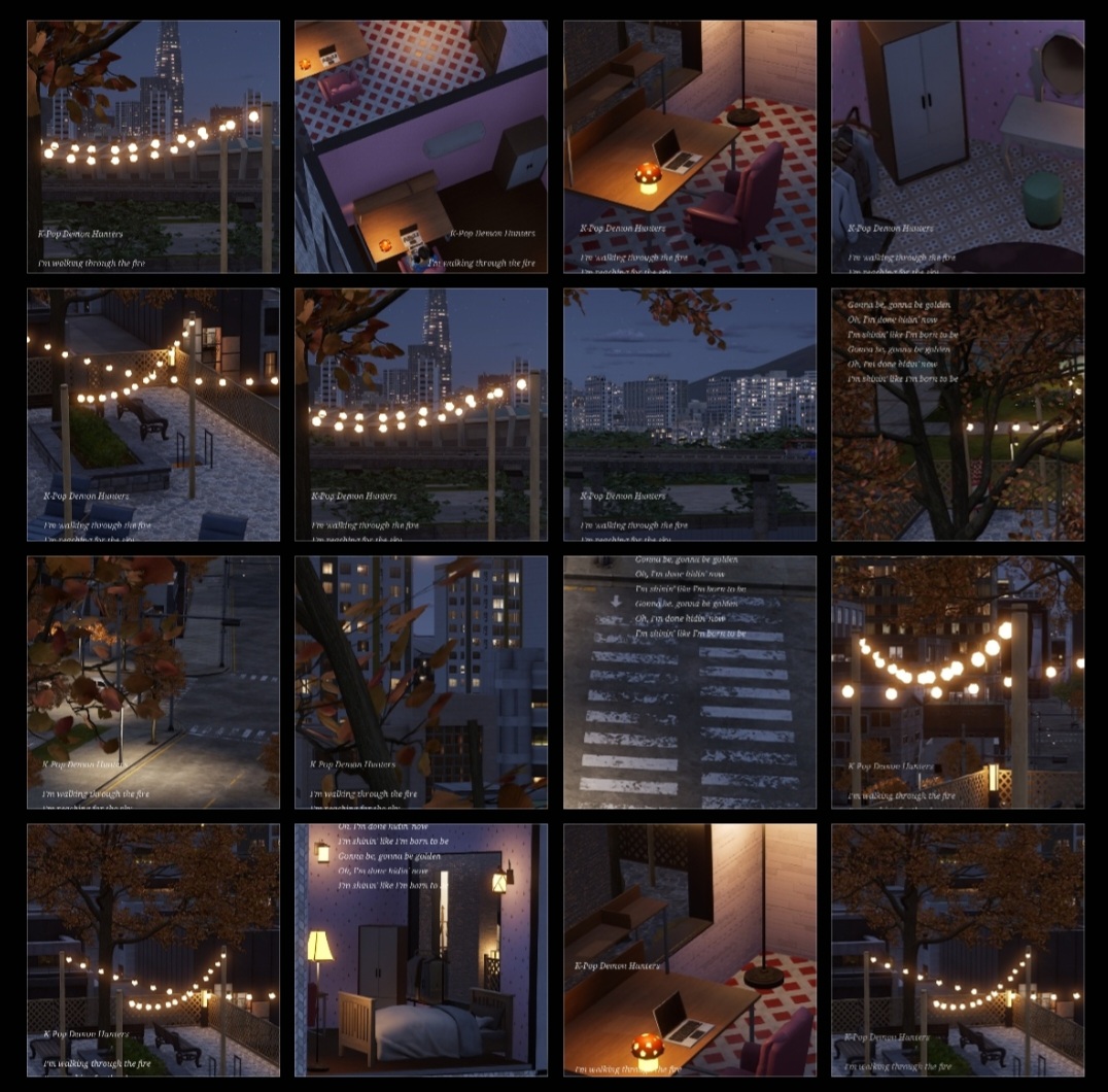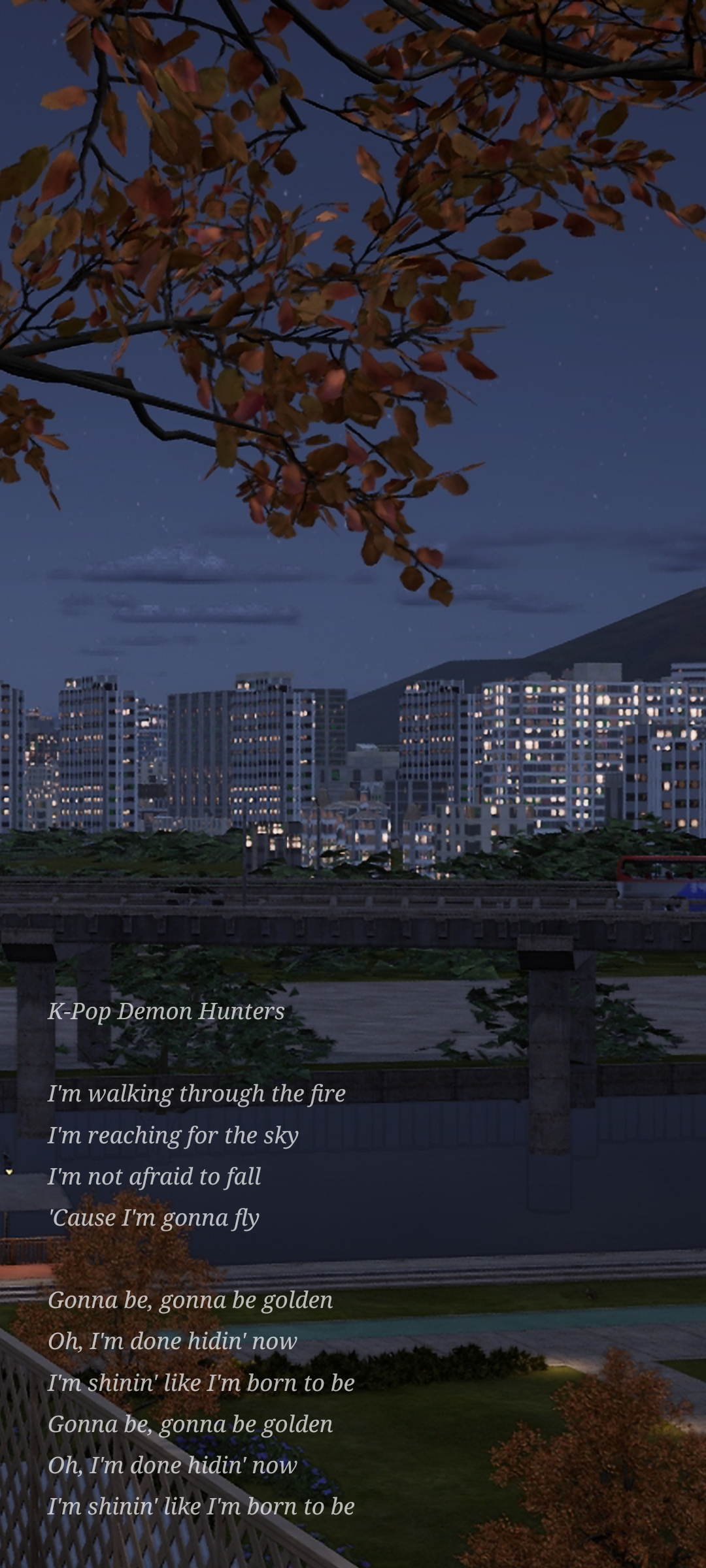 케이팝 데몬 헌터스의 활약 무대가 된 한국의 현대적 도시 3d 배경이미지와 아이돌 그룹의 명곡 가사를 녹인 폰바탕화면입니다. 야간조명의 풍경이므로 폰화면의 눈부심과 시각적 피로감을 줄여주며 깔끔하고 시원한 가을 풍경을 선물합니다!